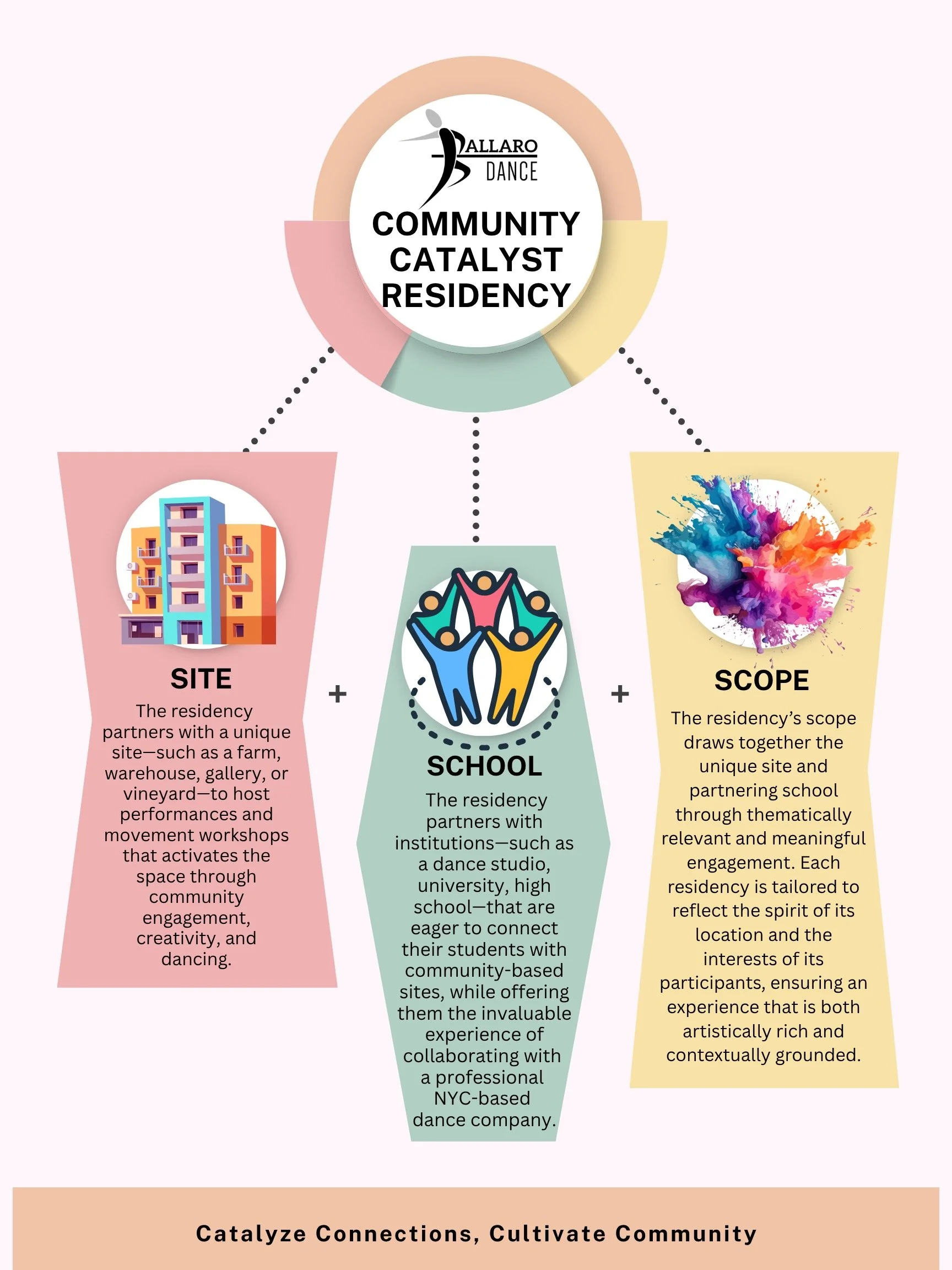 By uniting a distinctive SITE, a partnering SCHOOL, and a thoughtfully crafted SCOPE, the residency serves as a conduit for community engagement, artistic exchange, and embodied exploration.